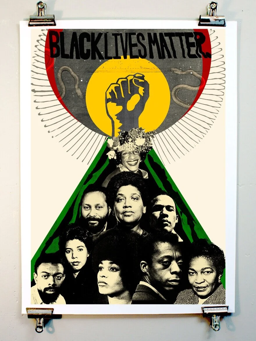 The print portrays some of the many inspiring Black activits, James Baldwin, Angela Davis, Audre Lorde, Lorraine Hansberry, Claudia Jones, Marsha P Johnson, Bob Kaufman, Amiri Baraka and Stuart Hall.
